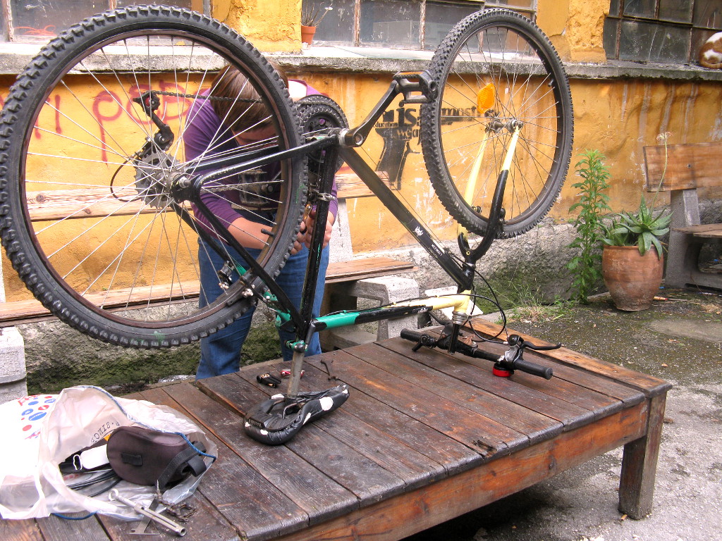 Ich bin in der neu eröffneten Bikekitchen (1) in Europas größtem besetzen Haus, dem Yfanet, in Thessaloniki zu Gast. Es wird geschraubt, gewerkt und gebastelt, diverse alte Räder werden auf Vordermann/Vorderfrau gebracht, denn es ist nicht mehr lang Zeit, dann geht es los...
