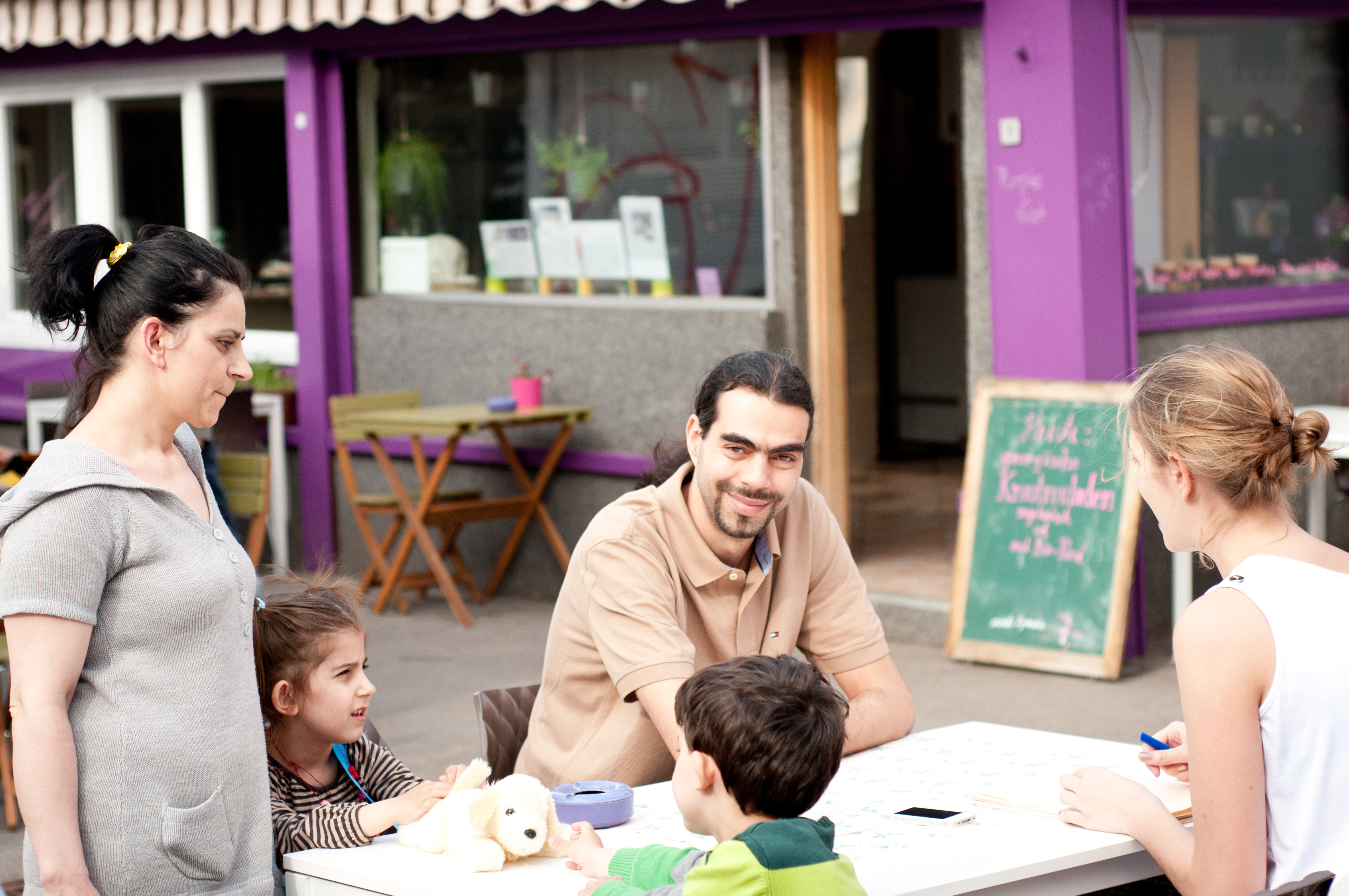 Besonders ist das Essen, das bei Purple Eat serviert wird, vor allem auch, weil es auf traditionelle Weise zubereitet wird. „Wir sagen den Leuten, die kochen, dass sie nicht versuchen sollen, die Rezepte in irgendeiner Weise an den österreichischen Geschmack anzupassen“, erklärt Kurosch Allahyari. Es werden bunt gemischt Speisen aus verschiedenen Ländern präsentiert, immer eine vegetarische Version und eine mit Fleisch. Das Ziel sei, ÖsterreicherInnen an andere Kulturen heranzuführen und gleichzeitig einen Ort zu schaffen, an dem die ehemaligen AsylwerberInnen mit den hier Ansässigen in Kontakt treten können. „Wir wollen Integration von einer anderen Richtung aufziehen. Es soll nicht darum gehen, dass die Ausländer endlich Deutsch lernen, sich integrieren und Leistungen erbringen. Sie sollen das tun können, was sie möchten.“ Frau Recepis Kinder spielen vor dem Lokal. Ihr Lachen wird nur durch den Wind unterbrochen, der hin und wieder die Tür des Stands mit einem lauten Knall zuschlägt. Momentan wird die Abschiebung der Familie Recepi vorbereitet. „Wir werden das nicht zulassen“, sagt Kurosch Allahyari. „Die Familie Recepi bleibt auf jeden Fall in Österreich.“