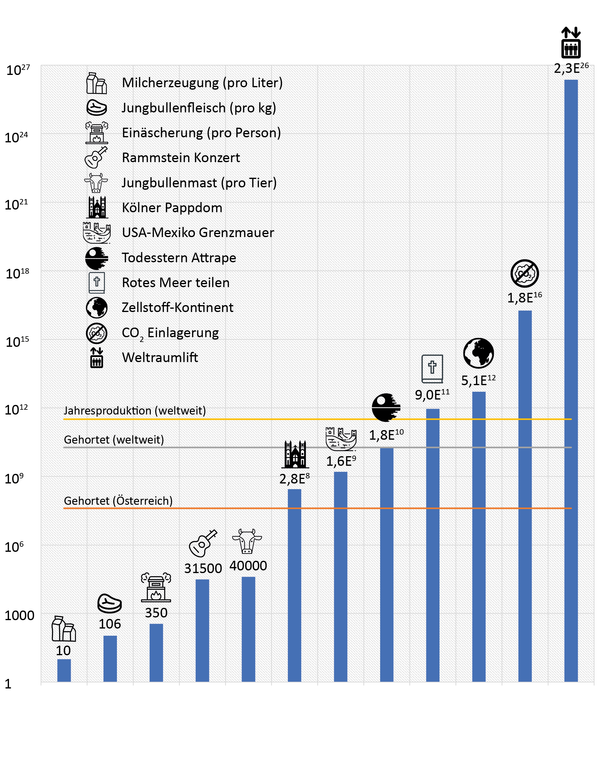 Es gäbe noch zahllose weitere Ansätze. Von der Energieversorgung für Rammstein (4t bzw. 31 Kilorollen pro Konzert), über die Verwendung als Futtermittel für Rinder (10 Rollen pro Liter Milch bzw. 106 Rollen pro Kilogramm Jungbullenfleisch), einen Kölner Dom aus Pappmaché (277 MR) und der Rettung des Weltklimas durch einen Zellstoff-Kontinent (5,1 Terarollen) bis hin zu einem Weltraumlift (mehr als 230 Yottarollen bzw. fünf Erdmassen) haben wir davon auch so manche durchgerechnet.