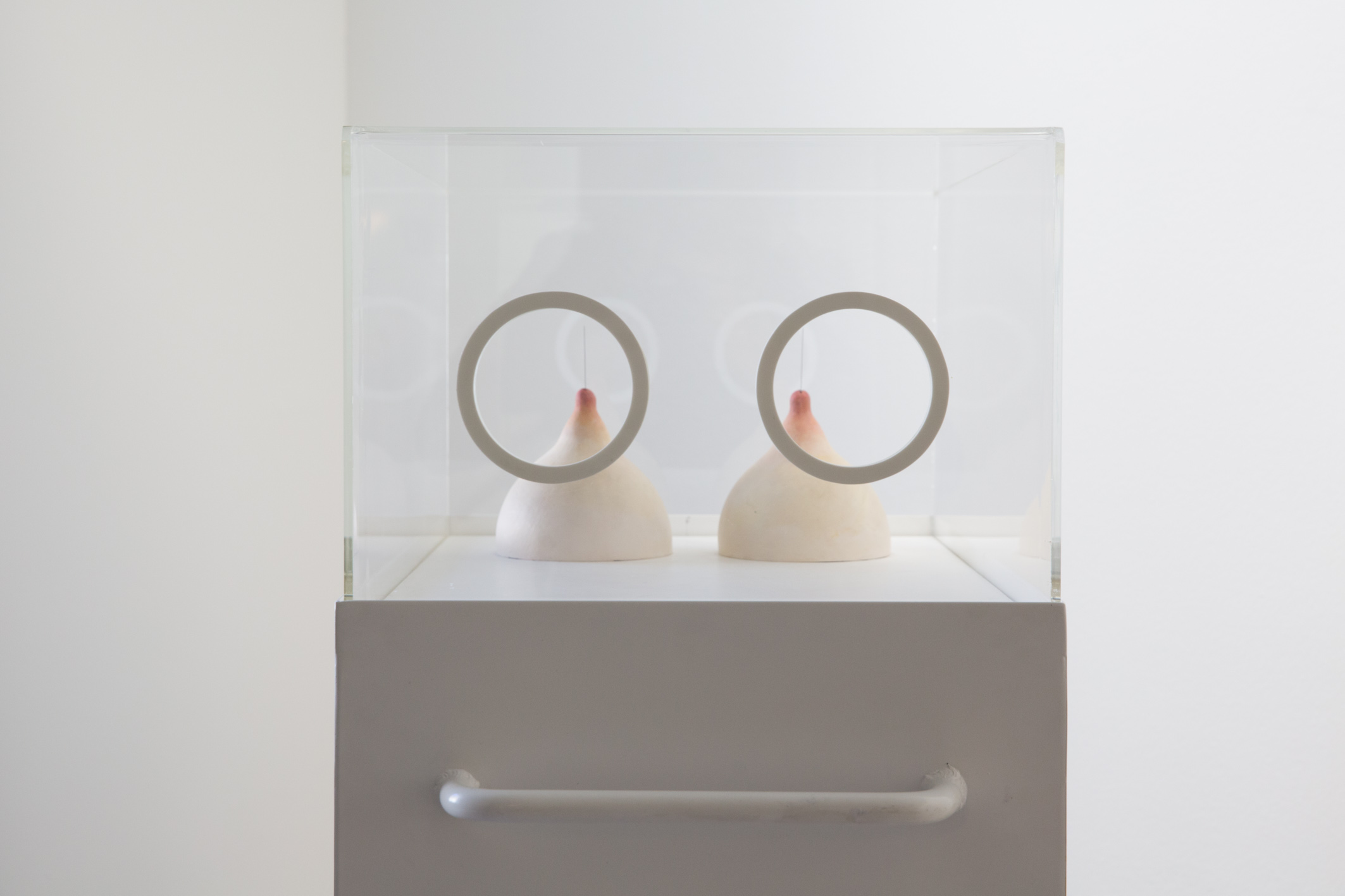 So divers die Beiträge der fünf Frauen und fünf Männer sind, es zieht sich ein mehr oder weniger starker Bezug zur bildenden Kunst durch – sei es in Form von Kooperationen oder inhärent in der eigenen künstlerischen Praxis. Brigitte Falkners Comics und Storyboards, Hanno Millesis Collagen aus Texten und Bildern alter National-Geographic-Magazine, oder die mit Schrift überzogenen (Kitsch-)Objekte von Theaterautorin Gerhild Steinbuch und Bühnenbildnerin Philine Rinnert befreien den Text von seiner klassischen Erscheinungsform in horizontalen Linien auf Papier. Nur die Ölbilder, die Katharina Weiß zu Clemens J. Setz’ sprachlichen Bildern gemalt hat, wirken allzu plakativ. Ihnen fehlt der Bruch – das Gesicht, „das wie ein Goldfischglas für den darin lebenden Schnurrbart wirkte“, ist auf dem Gemälde nichts anderes. Und bei manchen Beiträgen, etwa Thomas Stangls oder Anna Weidenholzers, wäre eine vorausgehende Lektüre der Romane interessant gewesen – aber dafür sind alle Besucher_innen wohl selbst verantwortlich. Dass beim Besuch das Verlangen nach schwarzem Text auf weißem Papier und den imaginären Welten, die darin lauern, aufkommt, ist doch eigentlich der größte Erfolg einer Ausstellung im Literaturmuseum. Und eben diesen Wunsch haben die Kurator_innen wohl antizipiert – in der mittig im Ausstellungsraum platzierten Autor_innenbibliothek können ihm die Unaufhaltbaren sofort nachgehen.
