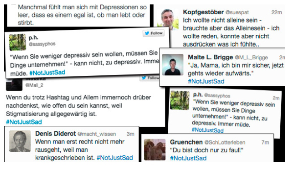 Zu den Stereotypen kommt oft Unverständnis von Nichtbetroffenen dazu. Auch wenn die Gesellschaft über psychische Erkrankungen heute sehr viel aufgeklärter ist als noch vor einigen Jahrzehnten, sind sie immer noch ein Tabuthema. Nicht nur die Tweets unter den Hashtags #isjairre und #NotJustSad zeugen von geringem Wissen darüber. So rät man zum Beispiel depressiven Menschen oft mehr an die frische Luft zu gehen, Urlaub zu machen und meint: „Jeder ist mal schlecht drauf, Kopf hoch!“ Dabei verkennt man, dass Depressionen eine schwere Erkrankung mit mannigfaltigen Symptomen sind. Eine Erkrankung, die nicht zu vergleichen ist mit „ein bisschen schlecht drauf sein“ und sich auch nicht durch gut gemeinte Tipps wie „iss gesünder“ oder „geh mal zum_zur Friseur_in“ heilen lässt.